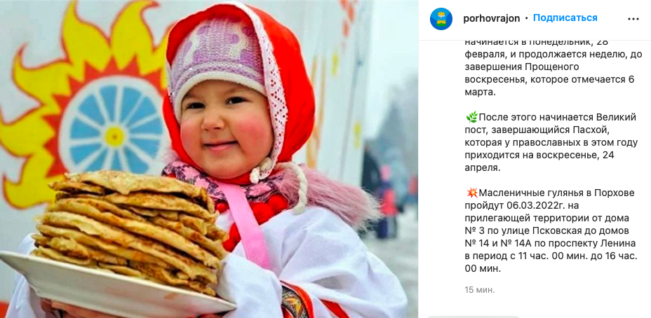 Несмотря на запрет публичных и массовых мероприятий, Порхов анонсировал проведение масленичных гуляний 6 марта на прилегающей территории от дома №3 по улице Псковская до домов №14 и №14А по проспекту Ленина в период с 11:00 до 16:00: объявление 28 февраля появилось на странице администрации Порховского района в Instagram.
