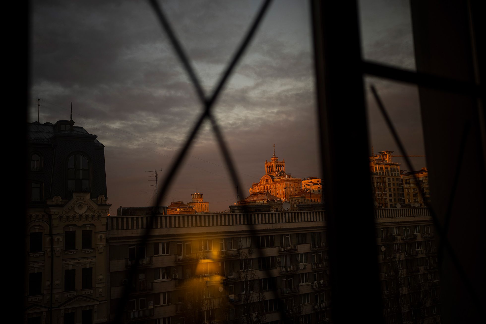 Emilio Morenatti / AP / Scanpix / LETA Закат в Киеве, снятый через окно квартиры. Оно заклеено на случай взрыва, чтобы избежать ранения от разлетающихся осколков. 28 февраля 2022 года