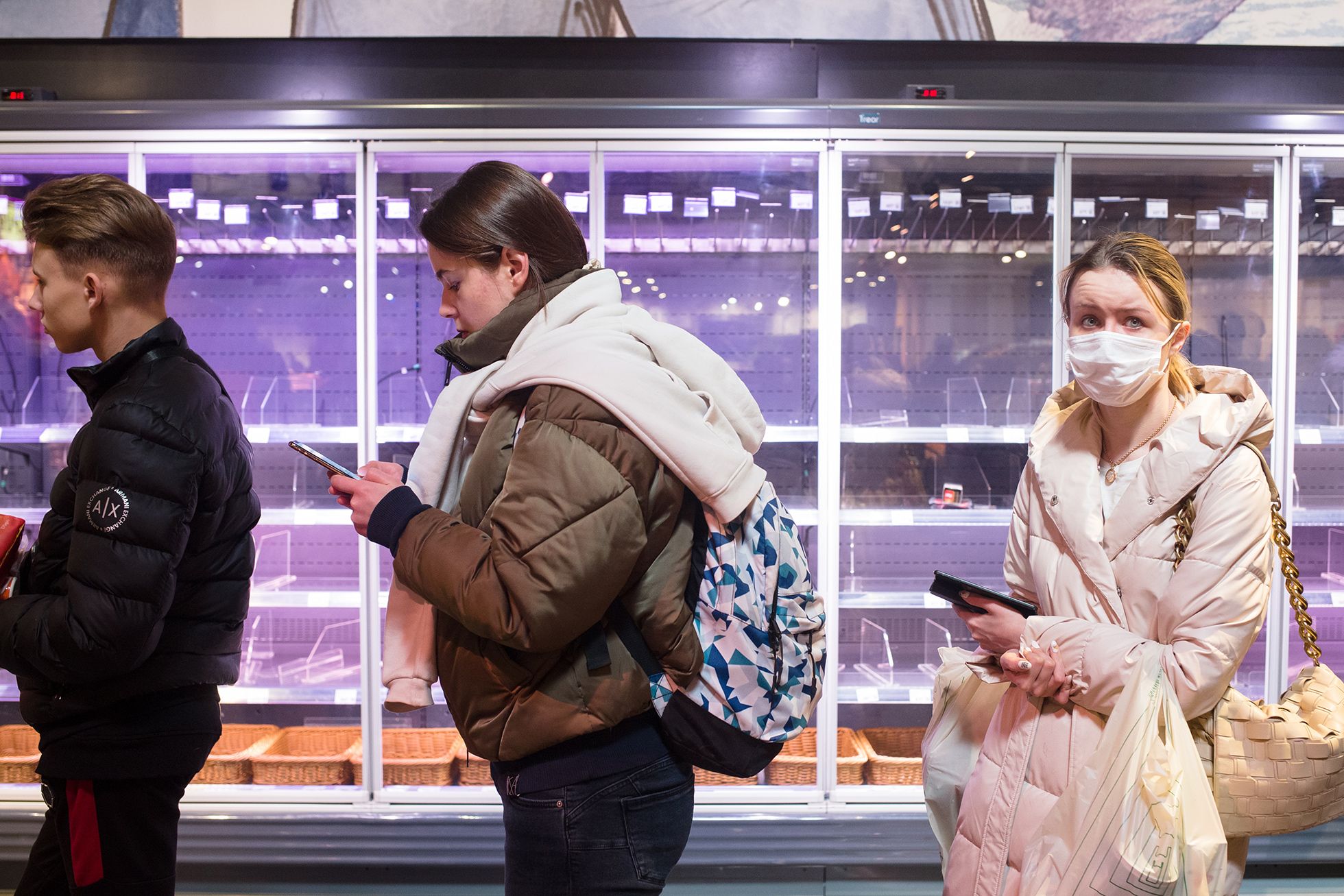 Anastasia Vlasova / Getty Images Очередь в продуктовом магазине, его полки пусты. Киев, 28 февраля 2022 года
