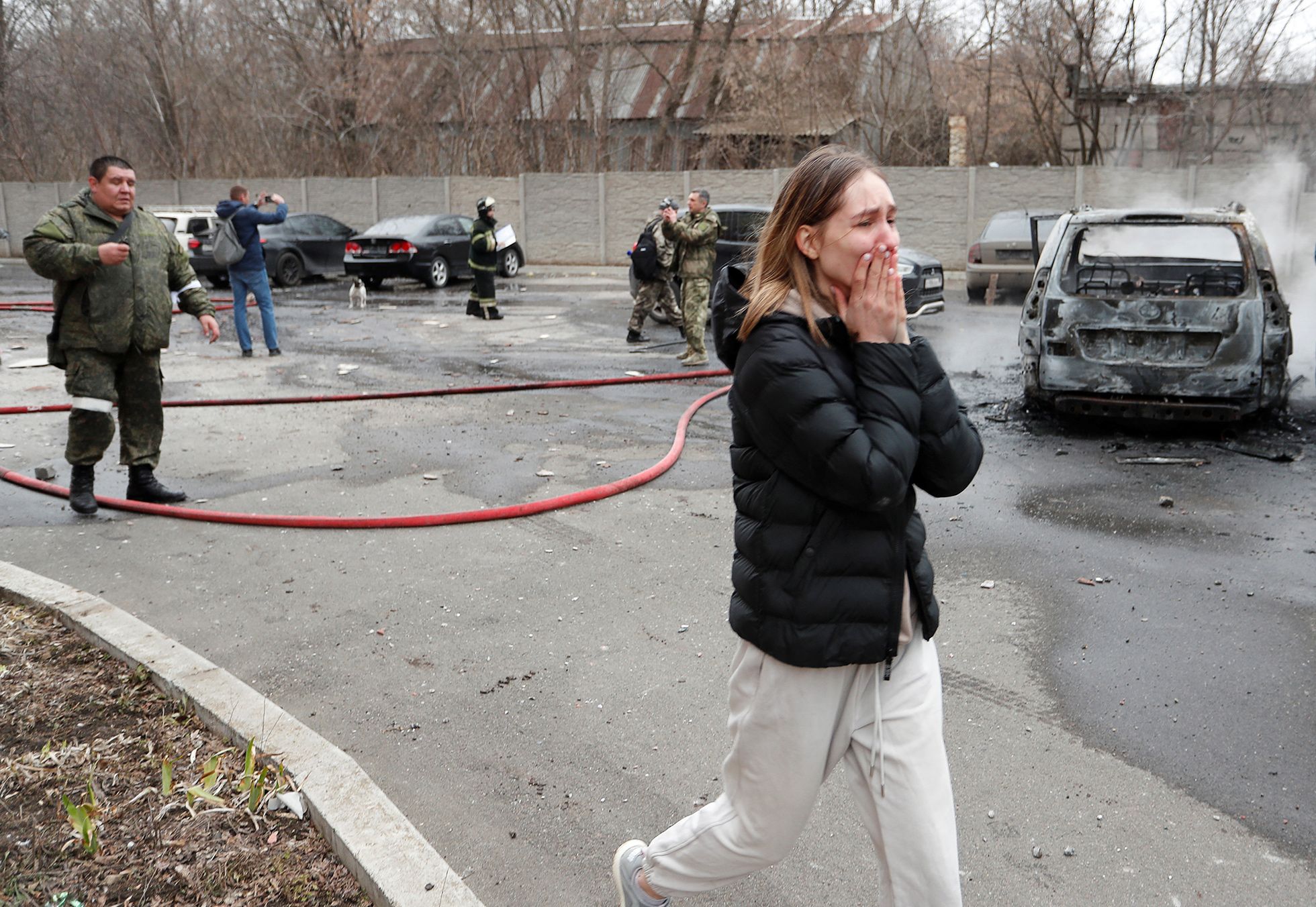 Alexander Ermochenko / Reuters / Scanpix / LETA Женщина после недавнего обстрела дома в подконтрольном сепаратистам Донецке, 28 февраля 2022 года