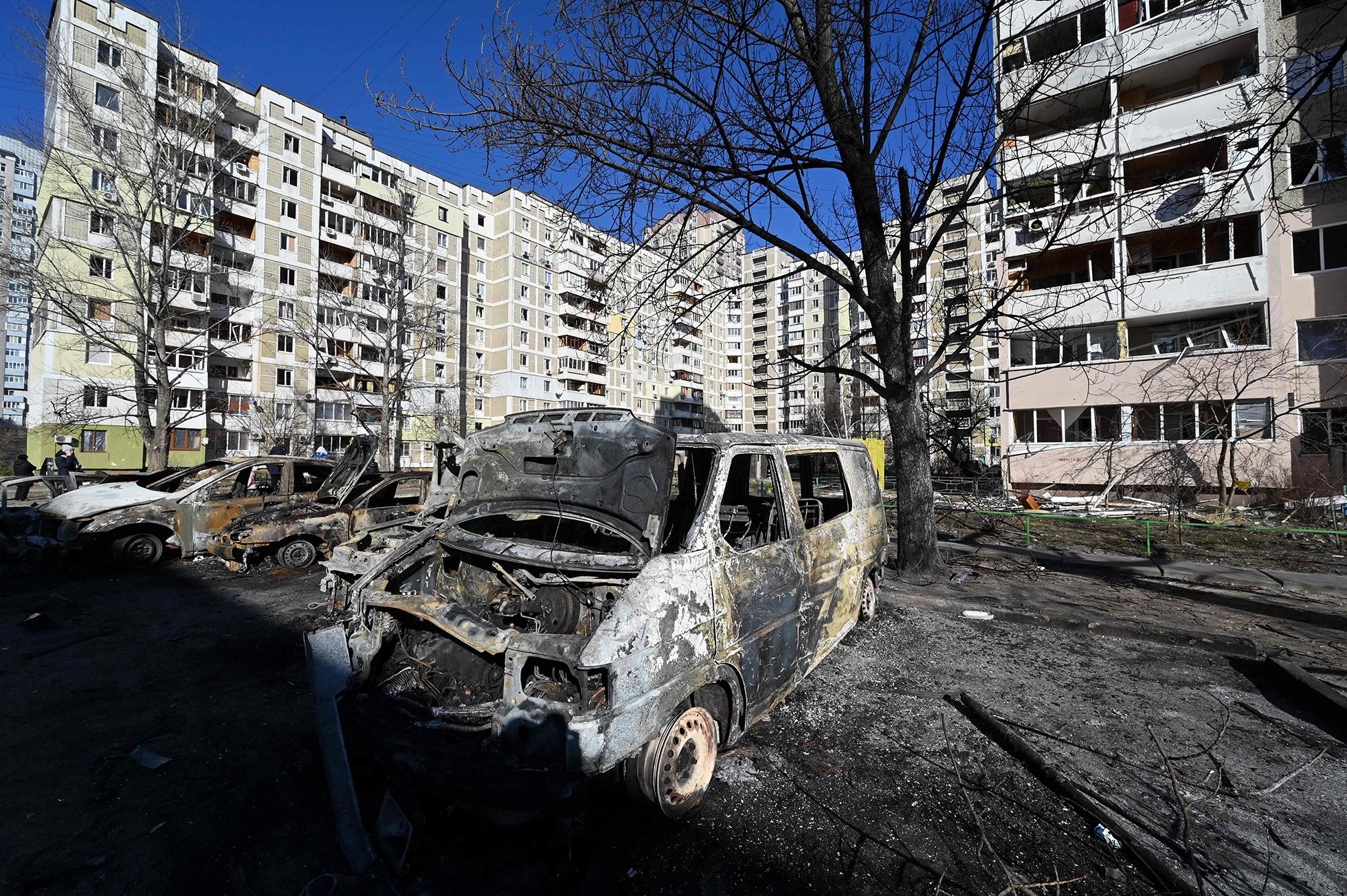 Genya Savilov / AFP / Scanpix / LETA Машины, сгоревшие в результате обстрела на окраине Киева, 28 февраля 2022 года