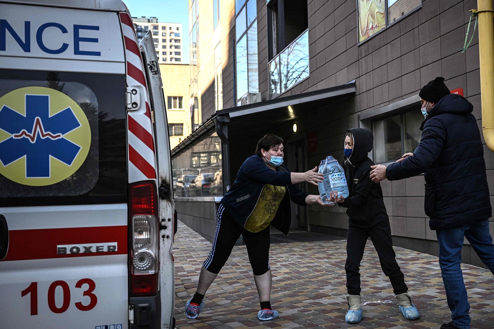 Aris Messinis / AFP / Scanpix / LETA «Скорая помощь» привезла воду к детской больнице в Киеве, 28 февраля 2022 года