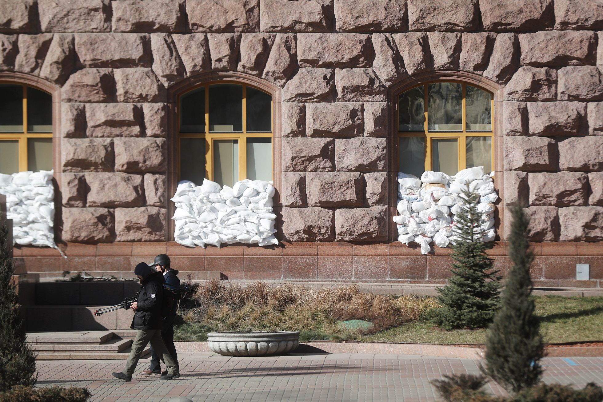Zurab Kurtsikidze / EPA / Scanpix / LETA Мешки с песком защищают окна Киевского городского совета, 28 февраля 2022 года