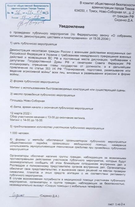 Томское отделение незарегистрированной Либертарианской партии России (ЛПР) подало в мэрию города уведомление о проведении митинга против боевых действий в Украине. Мероприятие планируют провести 12 марта на площади Ново-Соборной.