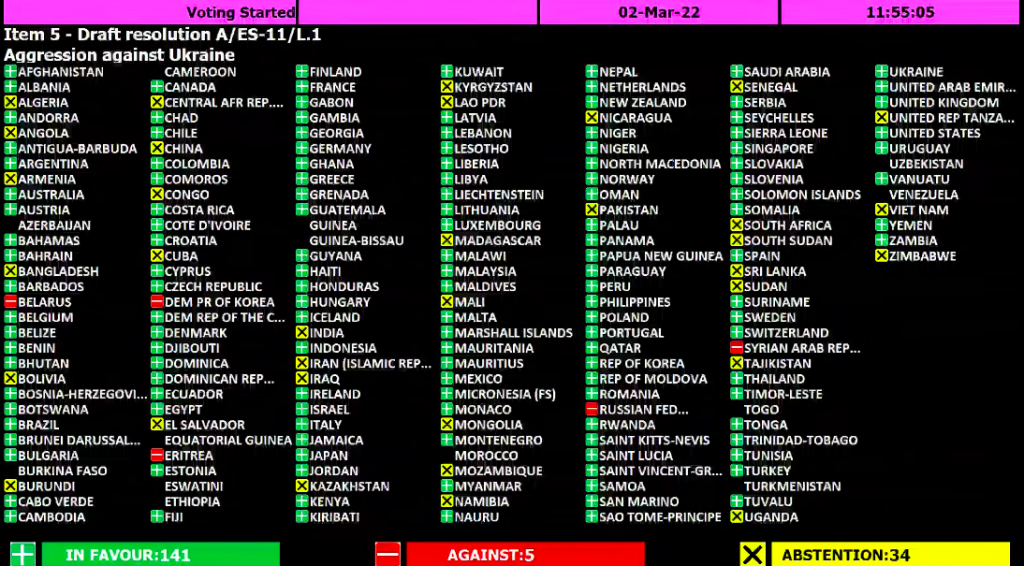 Генассамблея ООН приняла резолюцию, чтобы потребовать от России прекратить военные действия на Украине и вывести войска. За проголосовала 141 страна, против — 5 (Россия, Белоруссия, Сирия, КНДР, Эритрея), 35 стран воздержались.