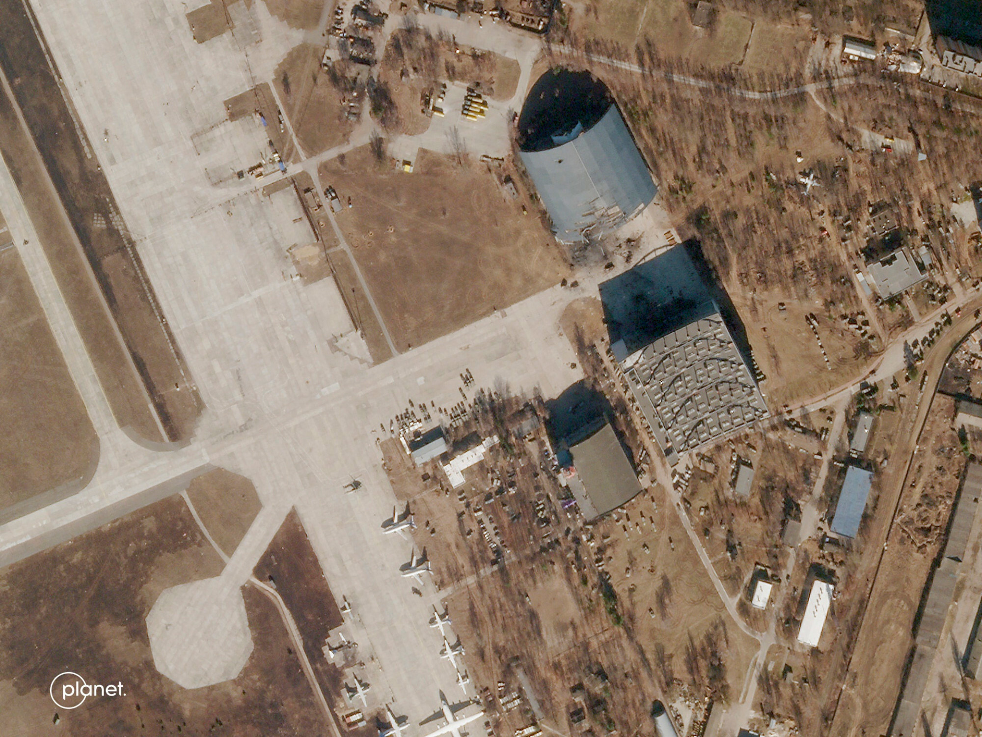 Повреждения аэропорта Антонов в Гостомеле. Спутниковый снимок: Planet Labs PBC / AFP