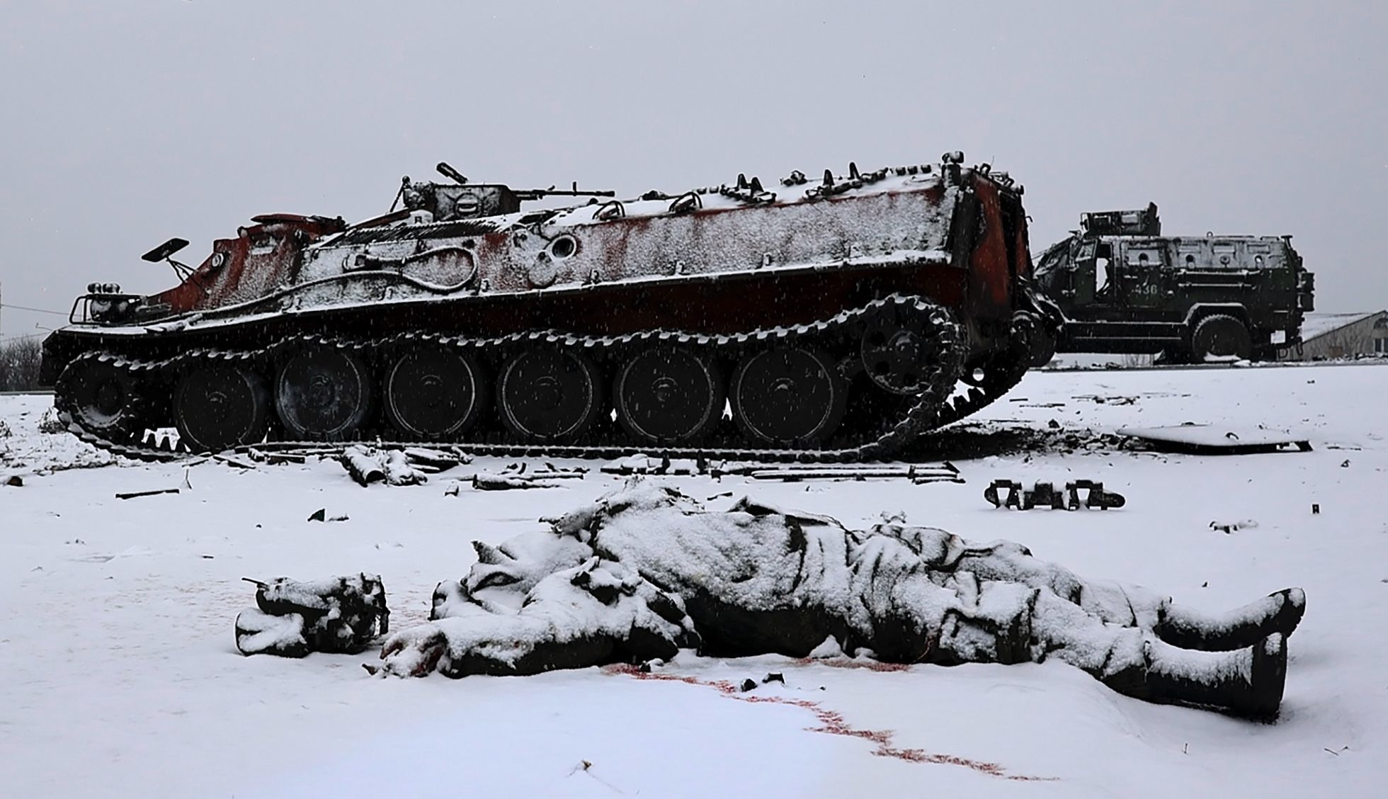 Sergey Kozlov / EPA / Scanpix / LETA Погибший военный около российской бронетехники. Окрестности Харькова, 25 февраля 2022 года