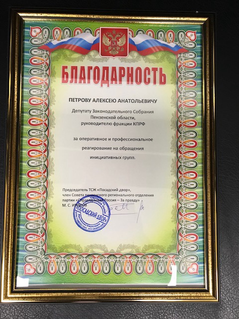 Чудные дела творятся в Законодательном Собрании Пензенской области. На наше предложение, сделанное еще месяц назад, торжественно объявить на сессии ЗС благодарность депутату от КПРФ Петрову с вручением благодарственного письма в красивой рамке, мы получили весьма странный ответ.