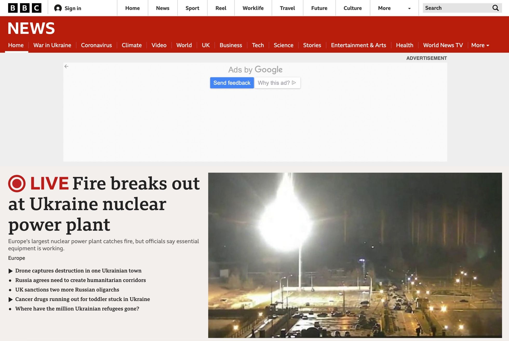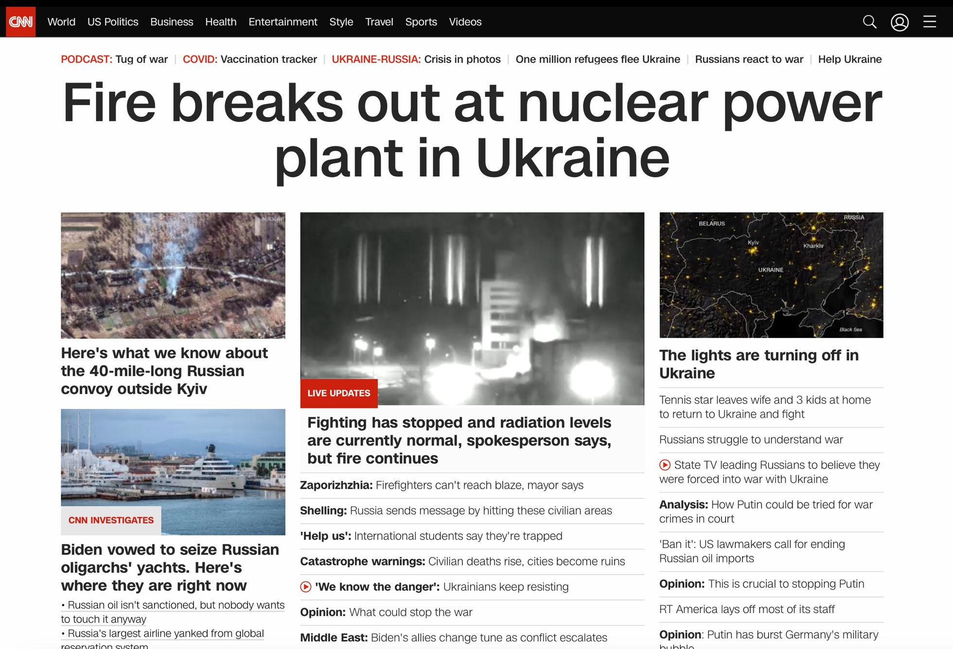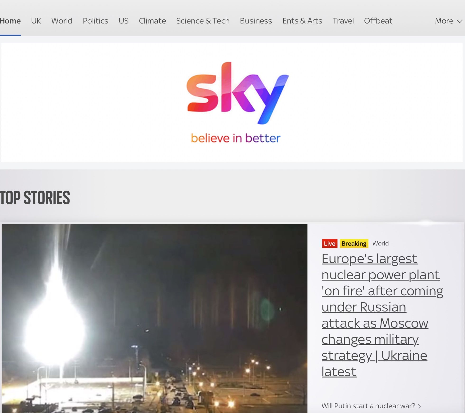 Зеленский заявил, что российские танки обстреливают атомный блок, все происходящее грозит катастрофой и «новым Чернобылем». Он призвал жителей европейских стран говорить своим политикам об обстреле АЭС. Потому что, сказал Зеленский, если взорвется хоть один энергоблок в Украине, то это будет «конец всему, конец Европе».