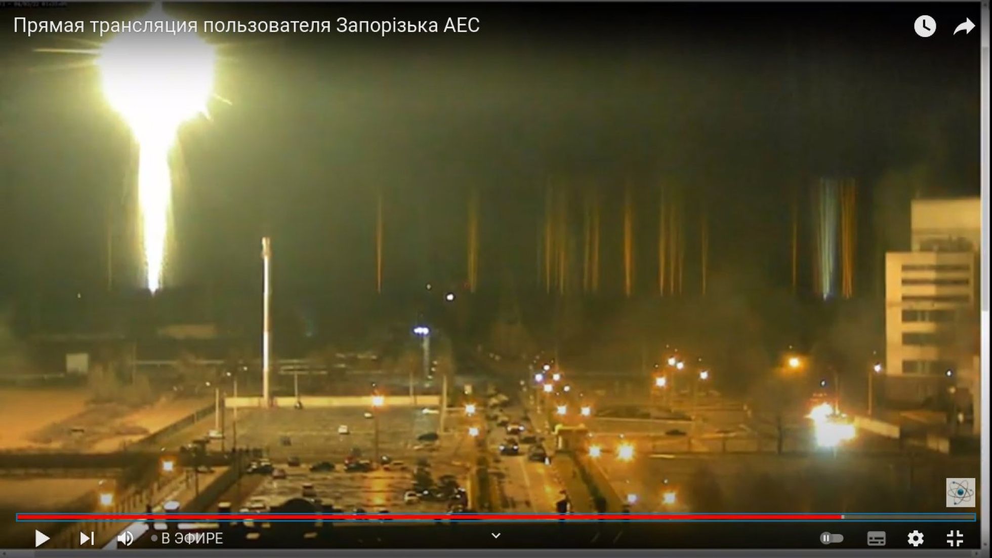 Примерно полчаса назад на АЭС было так. Сейчас, судя по трансляции, обстрел прекратился, а вот пожар продолжается.