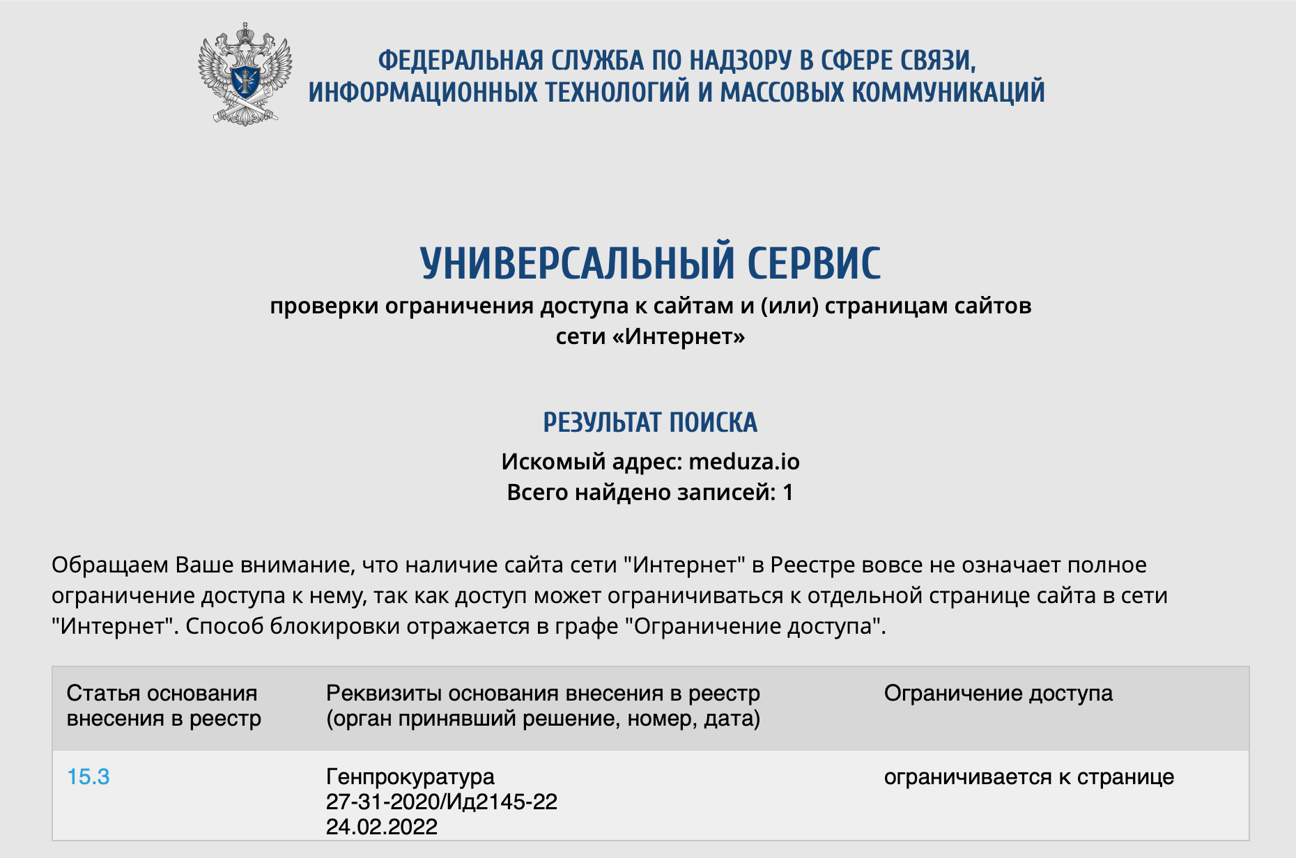 Соответствующая запись есть в сервисе Роскомнадзора для проверки ограничения доступа к сайтам и страницам сайтов. В материалах сервиса сказано, что доступ «ограничивается к странице» из-за решения Генпрокуратуры РФ от 24 февраля 2022 года.