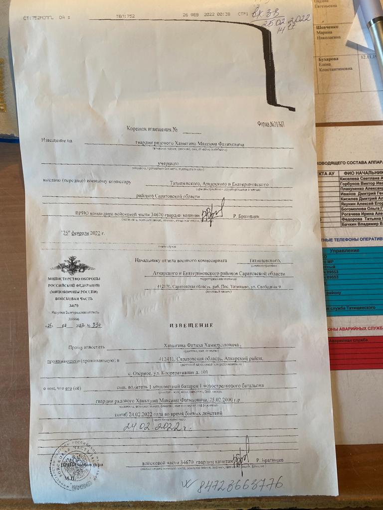 Максим погиб 24 февраля, в первый день боевых действий. На следующий день матери Максима Людмиле Ханыгиной позвонил глава Татищевского райвоенкомата, чтобы сообщить ей страшную весть.