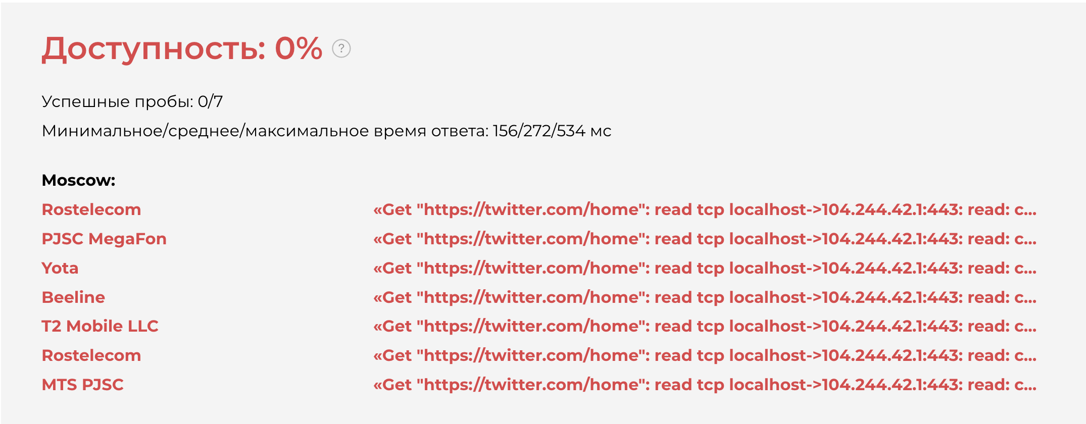Дата04.03.2022АвторСкрытИсточникМедиазонаСохранённая копияInternet ArchiveOriginal MaterialShow translationРоскомнадзор заблокировал Twitter Роскомнадзор заблокировал в России социальную сеть Twitter, сообщается на сайте регулятора. Скриншот GlobalCheck