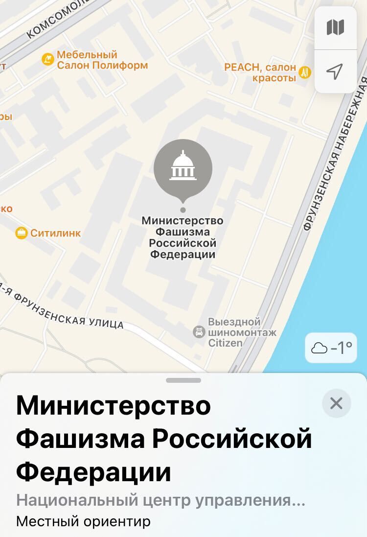 Роскомнадзор потребовал от Apple незамедлительно изменить наименование Минобороны РФ в Apple Maps на официальное. Ранее на картах Apple вместо министерства обороны написали «Министерство Фашизма Российской Федерации».