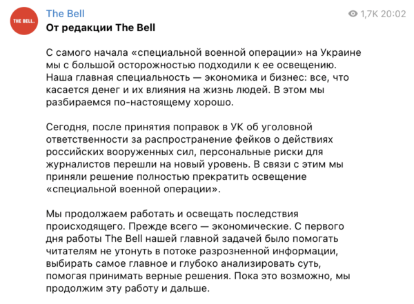 «Republic тоже придётся скрыть часть материалов о „специальной военной операции“, а часть изменить. Кроме того, в дальнейшем мы вынуждены отказаться от оперативного освещения украинских событий, сосредоточившись на оценках, мнениях, аналитике и описании последствий. Причём и в этих жанрах, вероятно, придется проявлять большую осторожность и пользоваться эзоповым языком».
