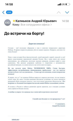 https://tjournal.ru/post/553687 * * *15:33 Для российской авиации, учитывая санкции и закрытие воздушного пространства ЕС и США, наступает туманное будущее. Сейчас гендиректор «Победы» написал прощальное письмо коллективу авиакомпании.
