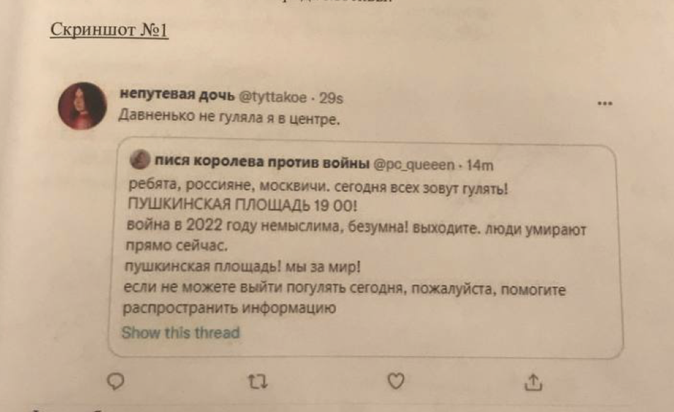 «Я представление устроила канеш норм. Пять раз заставила правильно назвать мой ник в твиттере, а потом еще и закрытку А КАК ***** [трахать] ТЕБЯ БУДЕМ», — информацию про 20 тысяч штрафа пользовательница твиттера "Пися королева против войны", авторка оригинального твита с призывом на площадь.