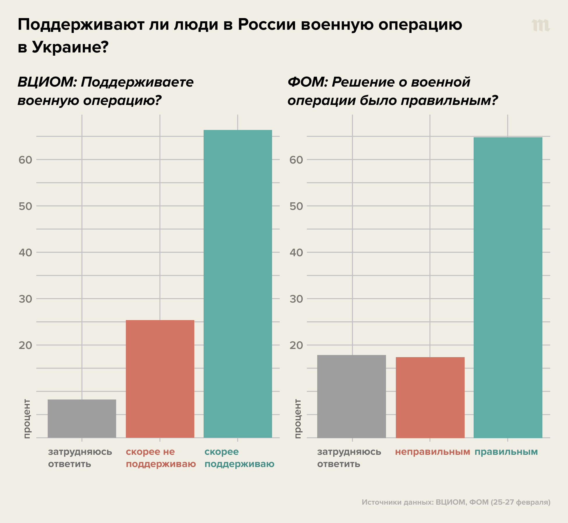 После начала военных действий в Украине две социологические компании — ВЦИОМ и ФОМ — провели опросы и спросили респондентов об их отношении к этим событиям. Результаты показывают, что около 65% россиян скорее поддерживают «специальную военную операцию» в Украине. Но можно ли доверять этим цифрам? Ведь ВЦИОМ и ФОМ контролируются российским государством (первый принадлежит государству, основной заказчик второго — администрация президента).