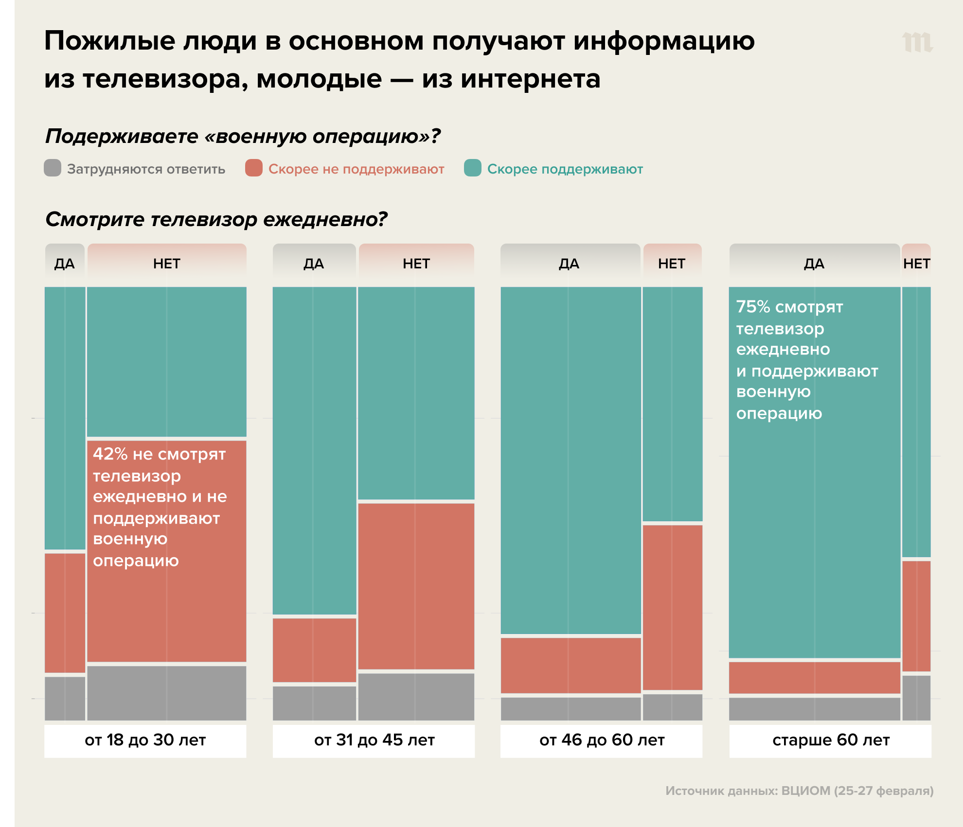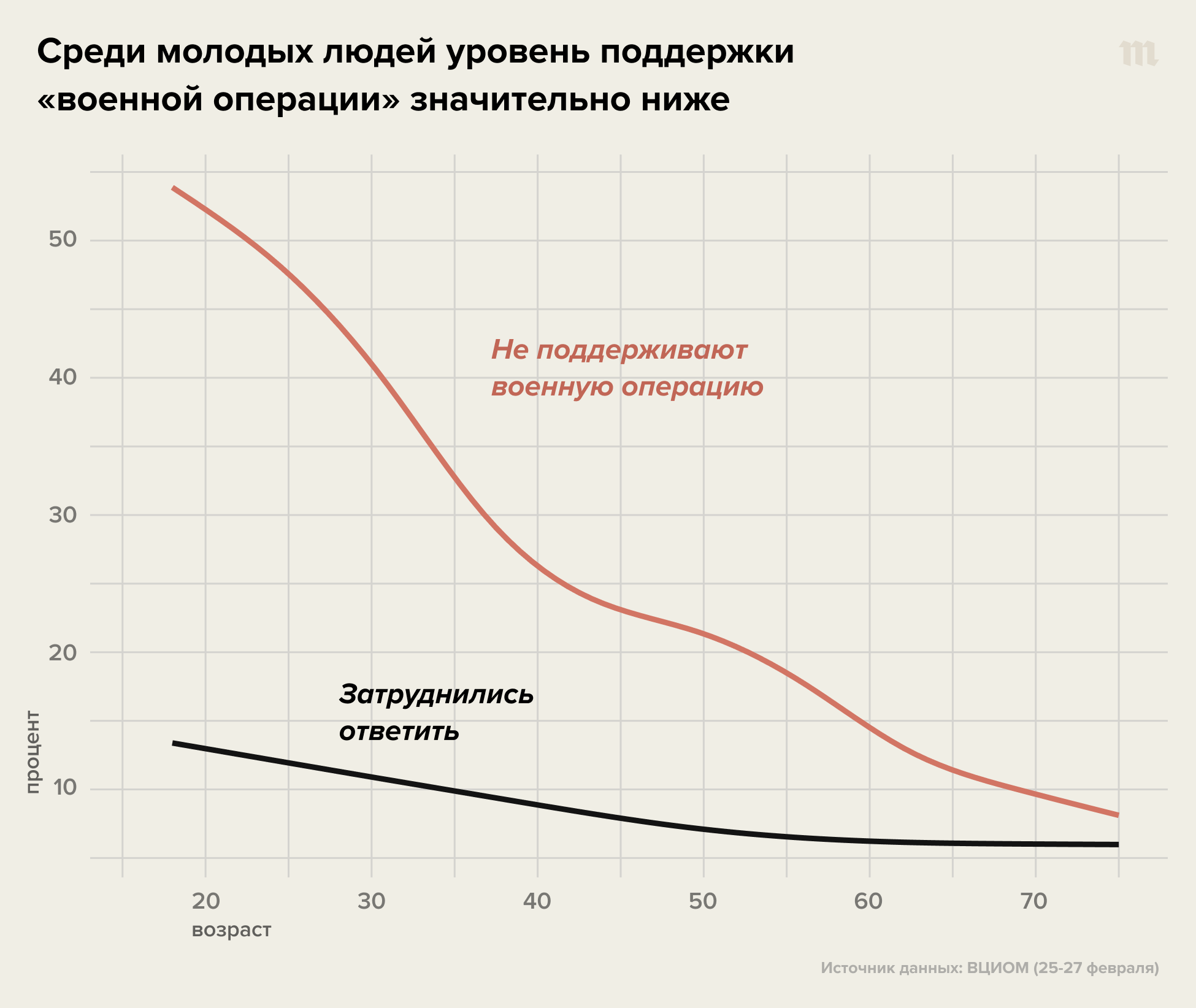 Основная социально-демографическая характеристика, определяющая отношение к военным действиям в Украине, — это возраст. Среди людей старше 70 лет девять из десяти скорее поддерживают «специальную военную операцию». Среди тех, кому нет 30, около половины выступают против, а из оставшихся многие «затруднились ответить» на вопрос.