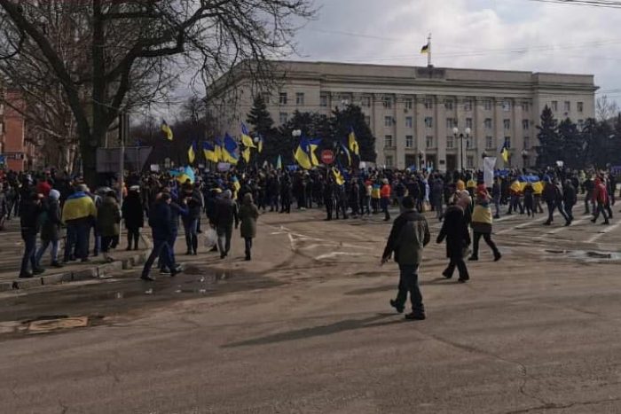 - На центральной площади Херсона, который полностью взят российскими военными, идет протестный митинг, передает УНИАН. На одной из видеозаписей слышна стрельба и ненормативная лексика. В описании ролика говорится, что стреляют российские военные, но люди не расходятся. Официального подтверждения информации о стрельбе нет; Минобороны не комментировало ситуацию.
