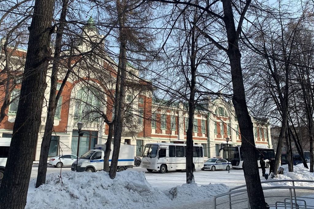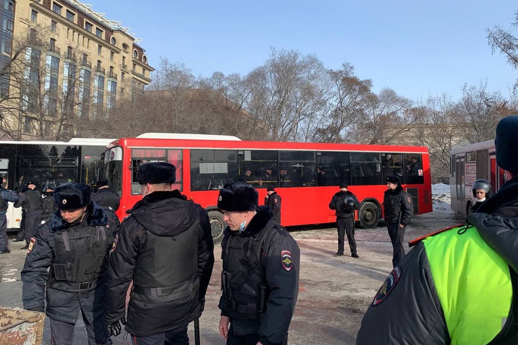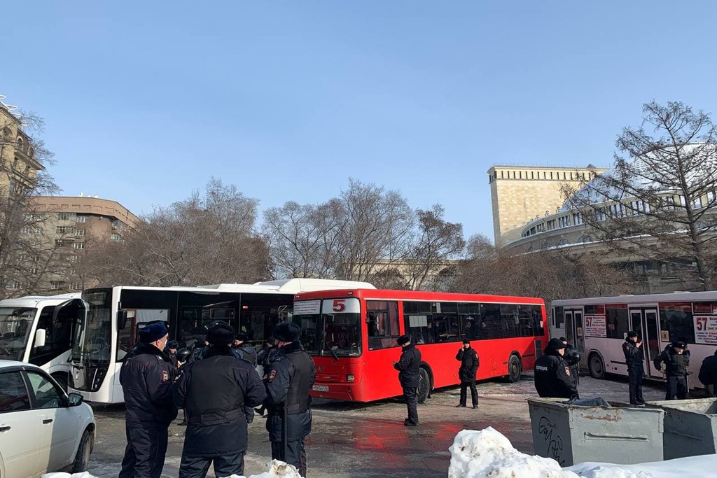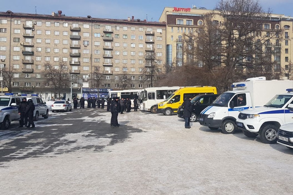 16:11 Полицейских свезли на площадь Ленина в центре Новосибирска на автобусах общественного транспорта. Ранее в пресс-службе ГУ МВД заявили, что не имеют информации о причине скопления сотрудников на другой площади в центральной части Новосибирска — Пименова.