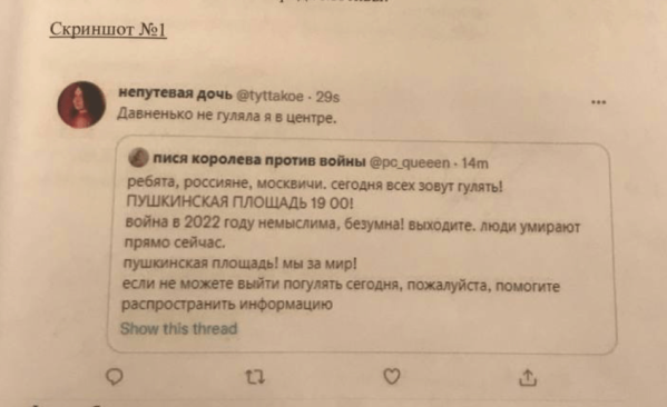 Фото Аттаровой в систему распознавания загрузил сотрудник Центра «Э», старший лейтенант Дмитрий Гребенчуков. Он же сделал скриншот «антивоенного» твита девушки — на это ему потребовалось 29 секунд.