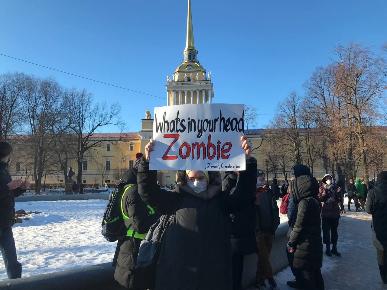 Avtozak LIVE Участница акции протеста держит плакат со строчкой из песни группы The Cranberries «Zombie»