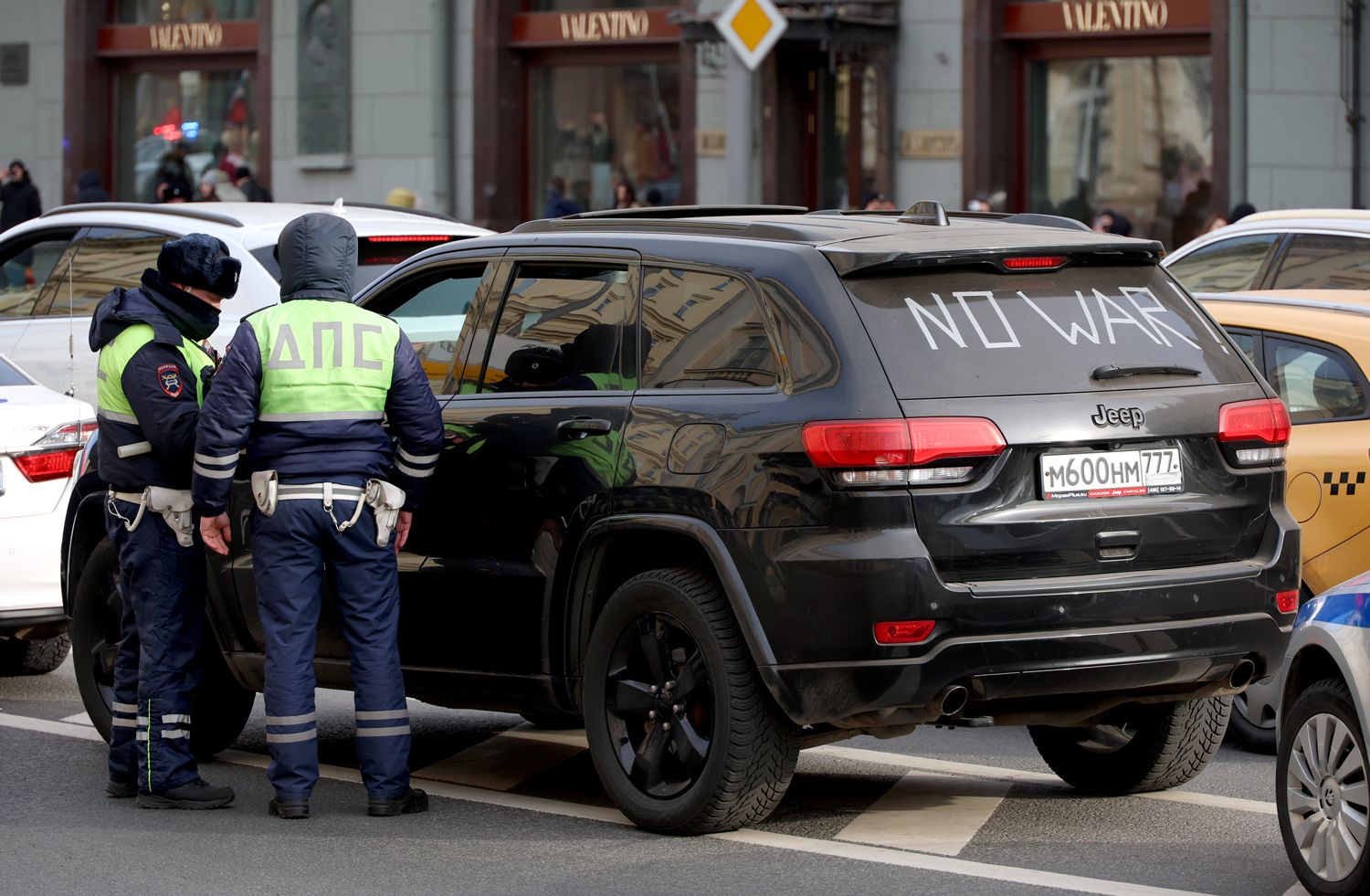 Вячеслав Прокофьев / ТАСС Сотрудники ДПС проверяют документы у водителя машины с надписью «Нет войне»