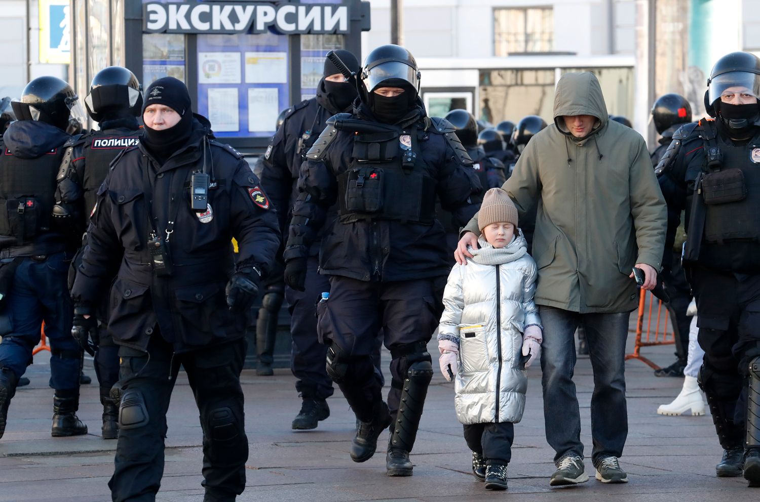 Анатолий Мальцев / EPA / Sсanpix / LETA Мужчина с ребенком в сопровождрении полицейских. По данным «ОВД-Инфо», на акциях 6 марта были задержаны как миинмум 113 несовершеннолетних
