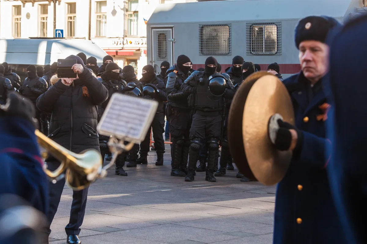 По площади перед «Гостинкой» в 12.30 курсировали десятки сотрудников Росгвардии, ДПС и ОМОН. Скучали, курили, пили кофе и слушали музыку. Больше двух часов публику здесь развлекал оркестр в полицейской форме, в числе прочих исполнявший песню Окуджавы «Десятый наш десантный батальон», хорошо известную по словам: «Нам нужна одна победа… мы за ценой не постоим».