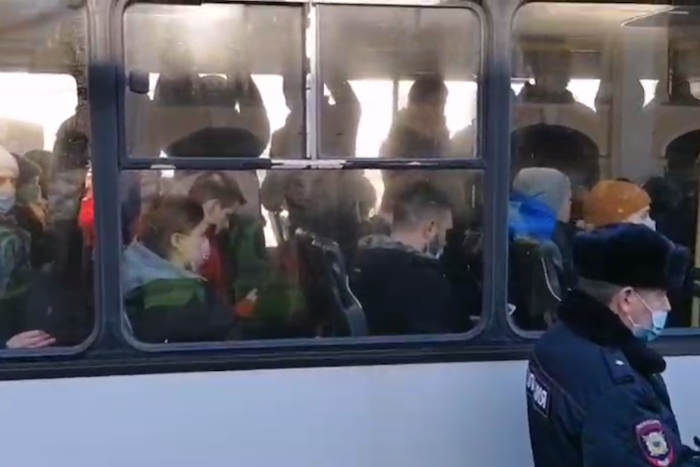 Очевидцы также сообщают о первом заполненном автозаке, отъехавшем от Гостиного двора. Параллельно на площади прошел небольшой военный концерт.