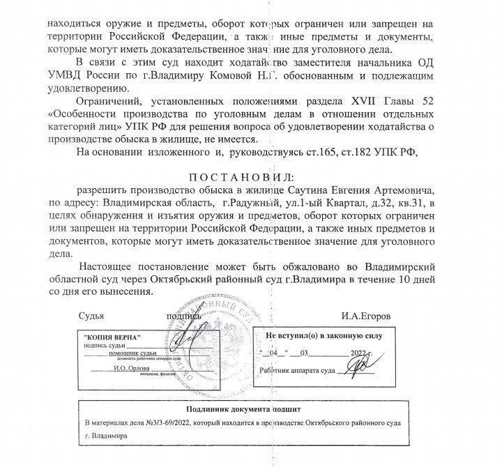 Как следует из представленных бумаг, основанием для проведения обыска послужило решение Октябрьского городского суда города Владимира, вынесенное в рамках уголовного дела о вандализме (ч. 1 ст. 214 УК РФ).