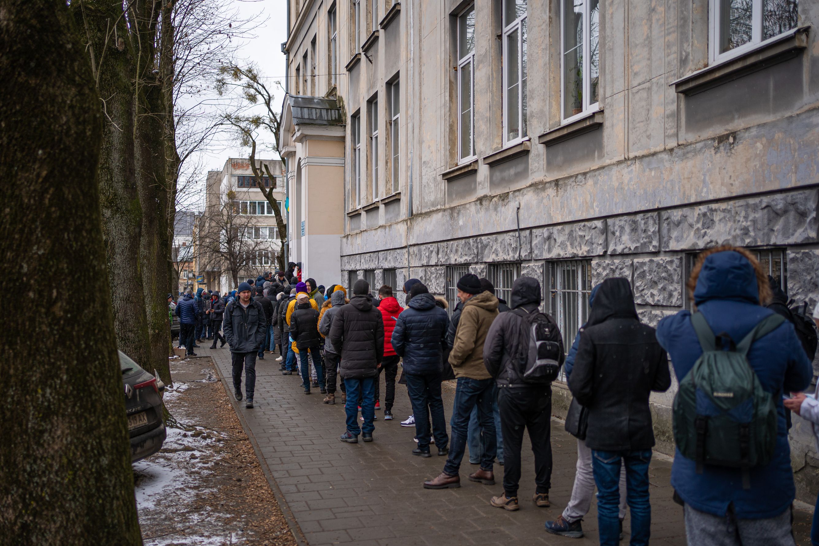 По улицам, расположенным возле военкомата, спешат люди с автоматами через плечо; у самого здания обсуждают что-то трое в кожаных куртках — видимо, тероборона. Из молодых призывников здесь только Дмитрий и 19-летний Михайло — он здесь, чтобы получить справку о негодности к службе и выехать за границу: нужное ему лекарство кончается по всей Украине.
