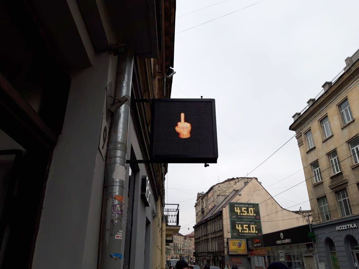 «Интим-бутик» «Полуничка» (позиционируют себя как «сеть секс-шопов № 1 в Украине») под своей обычной вывеской разместил красную бегущую строку с фразой, которая за две недели войны стала слоганом украинского сопротивления: «Русский военный корабль, иди ***** [к черту]!»