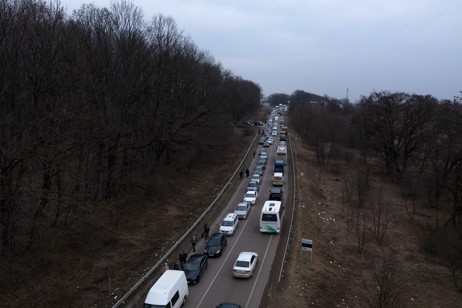 «Это все брошенные машины!» — говорит украинский волонтер Владимир, который машет рукой в сторону оставленного поперек обочины «Опеля». Помимо корреспондента «Медузы» он везет из польского Пшемысля во Львов гуманитарную помощь: печенье, бутерброды, минеральную воду со вкусом лесных ягод.
