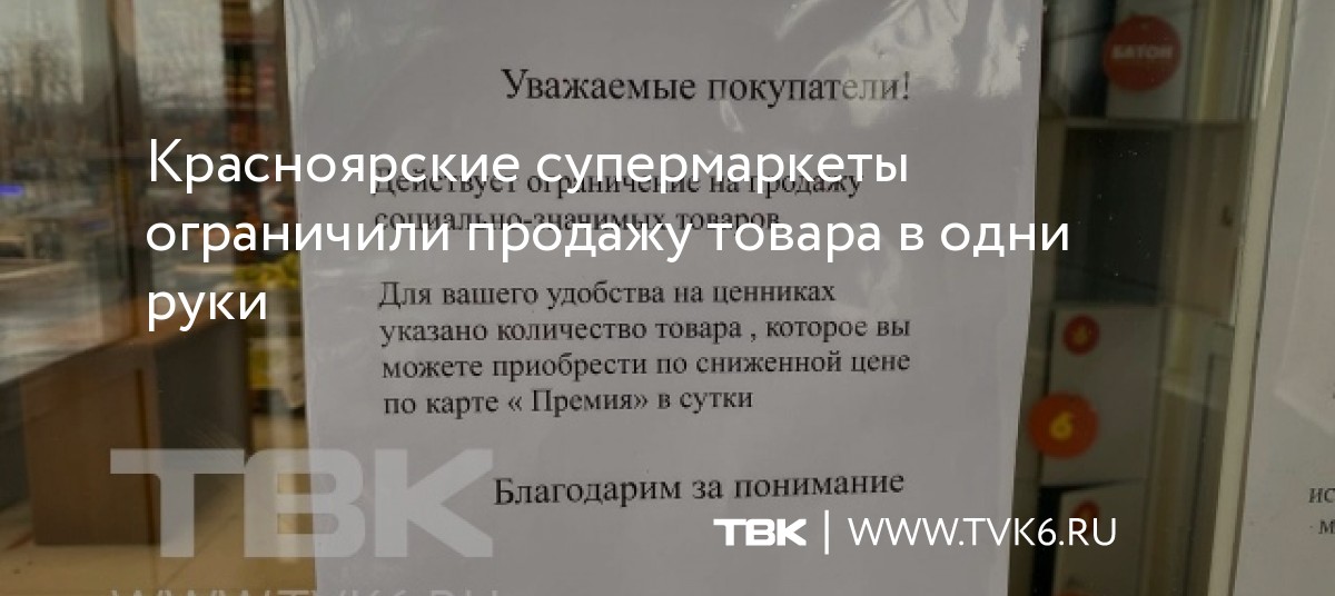 Объявления об ограничении продаж появились в «Красном яре», «Командоре», «Батоне», «Ленте» и других сетях. В пресс-службе «Красного яра» «ТВК Красноярск» сообщили, что установили ограничения на продажу части товара в сутки. Они коснулись круп, макарон, сахара, соли и подсолнечного масла.