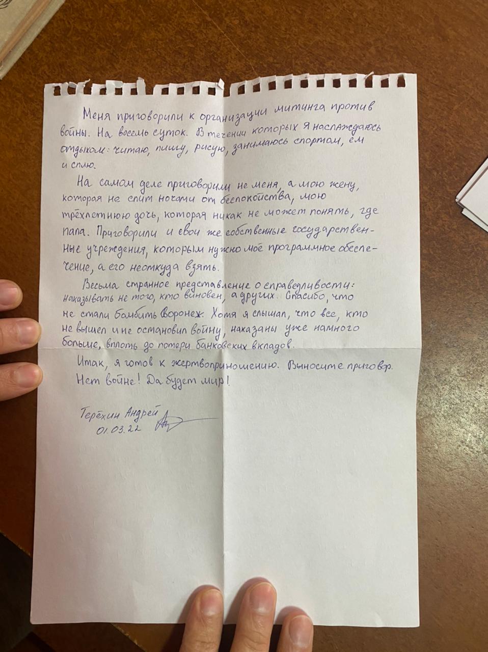 – 24 февраля, поздним утром, мы узнали о вторжении в Украину, и ближе к вечеру, после работы, Андрей пошел на площадь в одиночный пикет, – объясняет жена активиста Анна Чернышова. – Там уже были люди. Вскоре его и других пикетчиков задержали. Потом всех выпустили, а Андрея нет. 25 февраля ему присудили штраф в 4 тысячи рублей якобы за неподчинение требованиям полиции. 26 февраля он опять пошел в одиночный пикет, на площади опять собрались люди, и его снова задержали.