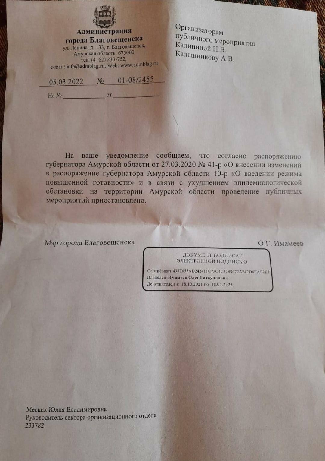Акцию планировалось провести 15 марта 2022 года в форме пикета. К участию в пикете заявлялось 19 человек, также планировалось изготовление плакатов с цитатами философа-пацифиста Цицерона. Соответствующее уведомление было направлено представителями "Яблока" в администрацию Благовещенска 4 марта 2022 года. Ответ из администрации Благовещенска датируется 5 марта 2022 года, однако известно о нем стало только сейчас.