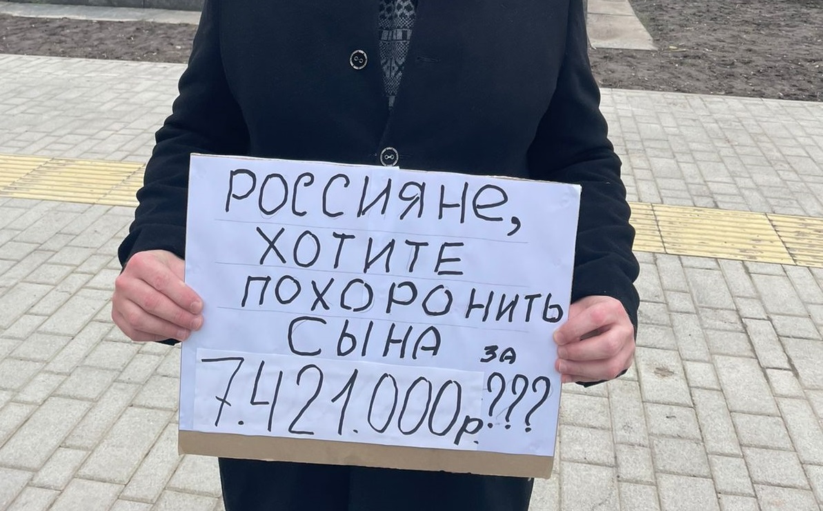Они держали плакат "Россияне, хотите похоронить сына за 7,421,000 р???" - именно такую сумму президент России Владимир Путин поручил выплатить всем членам семей военнослужащих, погибших в ходе боевых действий в Украине.