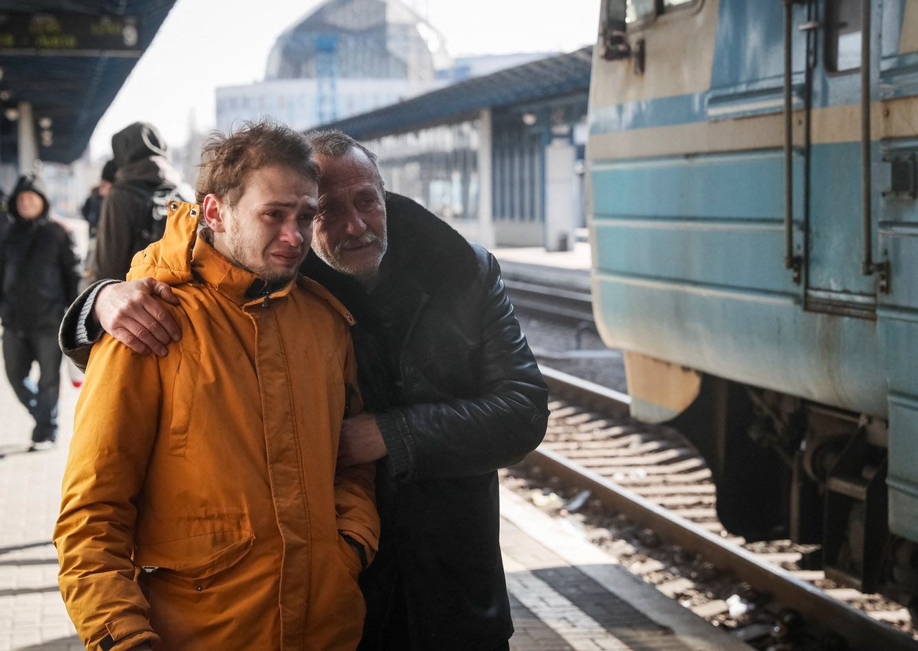 Gleb Garanich / Reuters / Scanpix / LETA Отец и сын перед отправлением эвакуационного поезда, на котором уезжают их родственники. Поезд едет во Львов из Киева