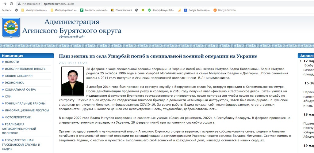 Официальный сайт Агинского Бурятского округа (входит в Забайкальский край), сообщил о гибели земляка в ходе «специальной операции» в Украине.