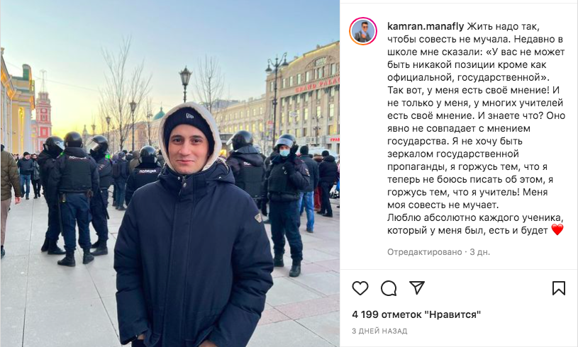 Скриншот «Таких дел» со страницы Кямрана Манафлы в инстаграмеФото: скриншот «Таких дел» Через два часа после публикации учителю позвонила директор школы Тамара Гордзейко и потребовала удалить запись. «Она сказала, что я сяду в тюрьму на 15 лет», — пояснил Кямран. После того как он отказался удалять пост, директор сказала об увольнении учителя.