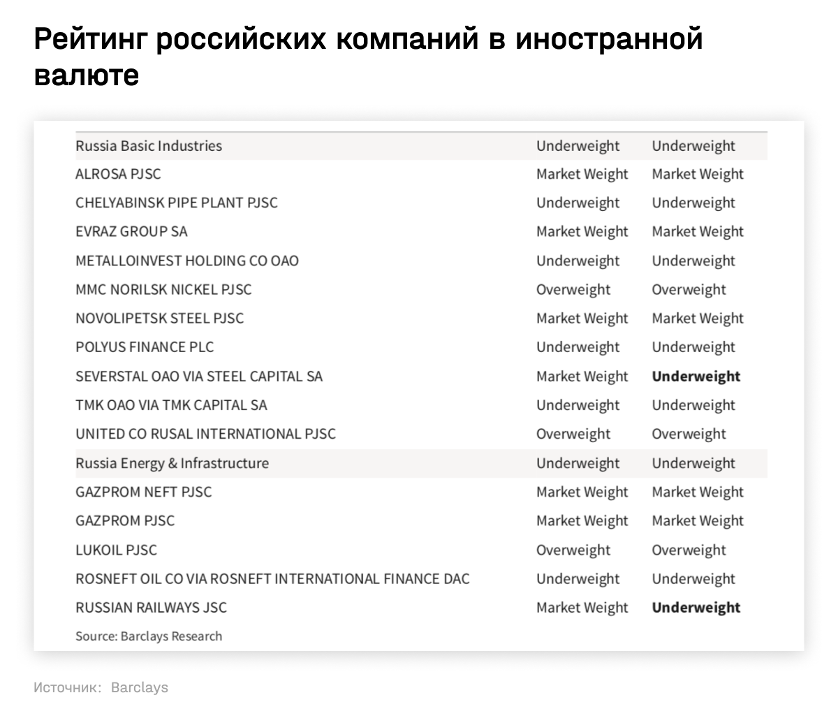 Одновременно Barclays понизил рейтинг «Северстали» до «продавать» (underweight), объяснив это уходом компании с европейского рынка после введения санкций против Алексея Мордашова, и РЖД — из-за низкой доли валютной выручки, небольших денежных резервов, а также «близости к российскому государству».