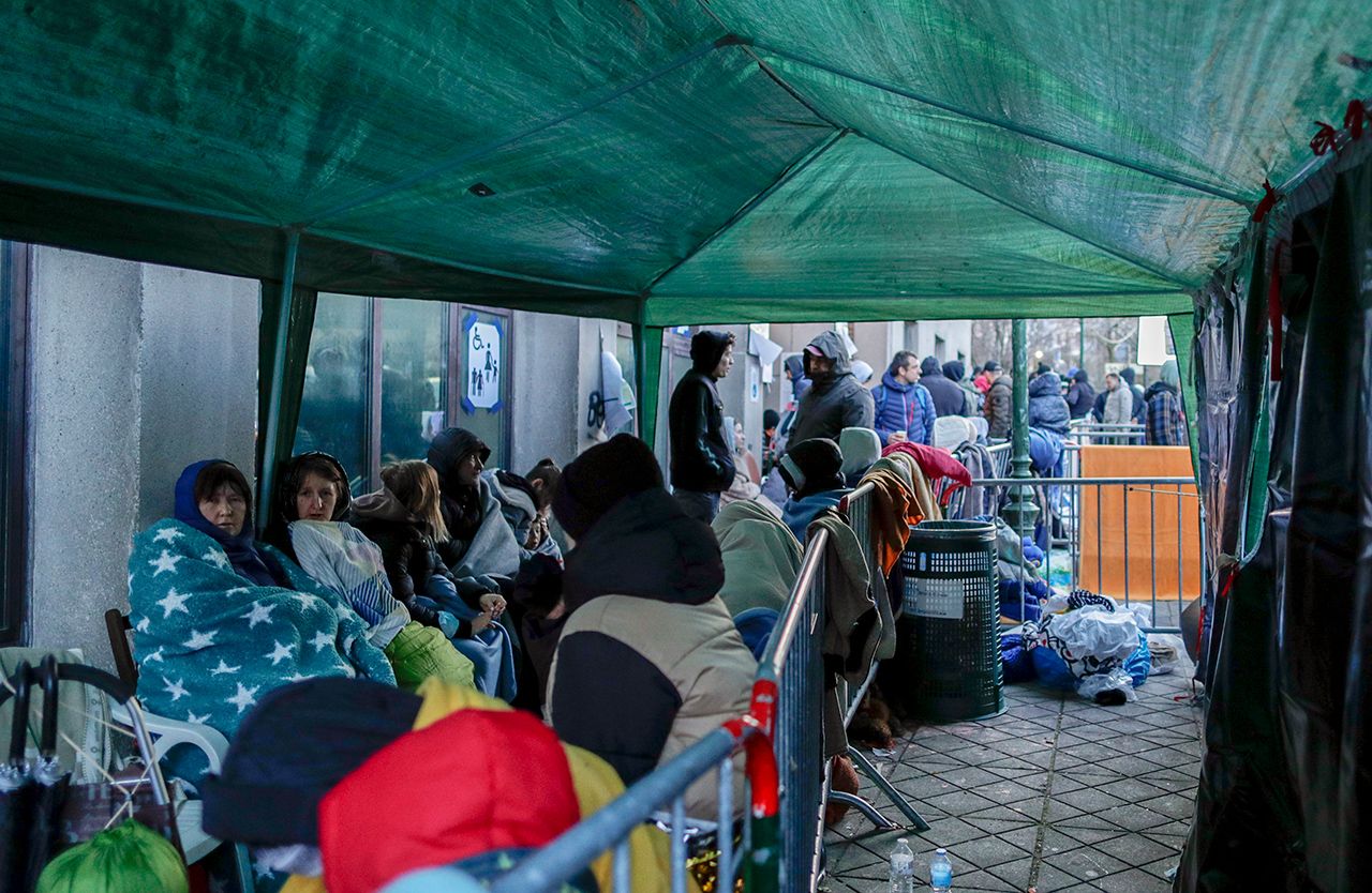 Украинские беженцы в очереди в миграционный центр в Брюсселе