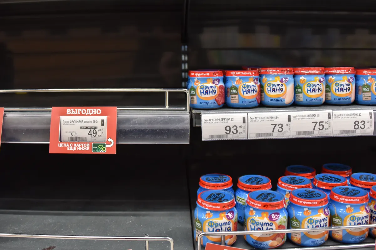 Полки заставлены пюре, банками со смесями — на них спроса нет. Мясная баночка пюре Gerber с говядиной — 209 рублей. С цыпленком — 195.