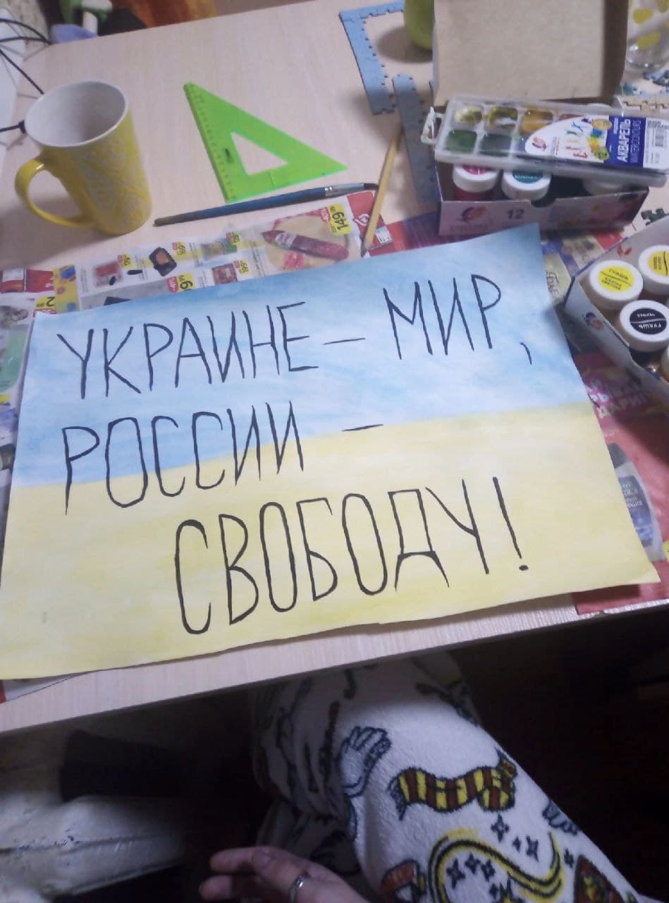 – Мама очень ругалась. Интернет нам отключили, из дома не выпускали. Мама сразу забеспокоилась, что у бати начнутся проблемы, "ну точно его сейчас уволят" и так далее, – рассказывают сестры. – Мы знали, что могут еще раз прийти к нам, и говорили маме: "Ты не открывай, типа нас нет дома". Но она открыла. Она и на звонки отвечает, и впускает всех. Пришли двое. Брали у мамы тоже какие-то показания насчет этого всего. Потом пришел замполит, из дивизии, беседовал с нами очень долго, тоже про колонию говорил. "Вот, у отца проблемы начнутся". Ушел. Под вечер пришли еще трое военных – военный психолог, подполковник какой-то, еще кто-то. Они явно ознакомлены были с делом: "А на каком фоне был плакат?" Они пытались детали выяснить: "А значок у тебя был? А если я соцсети проверю, я там ничего не найду?" Мама еще боится, что потеряет выплаты, которые нам причисляются "за войну", а там много. Замполит напоминал про военную ипотеку: "А если вы квартиру потеряете? Такое тоже может быть". Мама очень испугалась. Полицейские еще позвонили маминому работодателю, сказали, что вот такая ситуация, и хозяйка магазина маме позвонила, тоже была недовольна всем этим. Тоже угроза увольнения была.