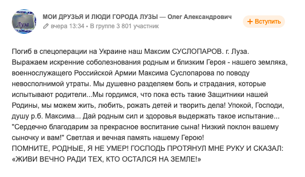 "Господи, не забирай наших детей… Его же нет, и не будет уже никогда… О дате похорон и возможностью проститься с Максимом сообщим позже", такую запись оставил отец погибшего офицера, житель города Лузы Кировской области Вадим Суслопаров в соцсетях.