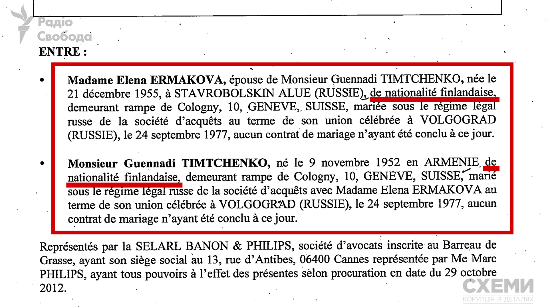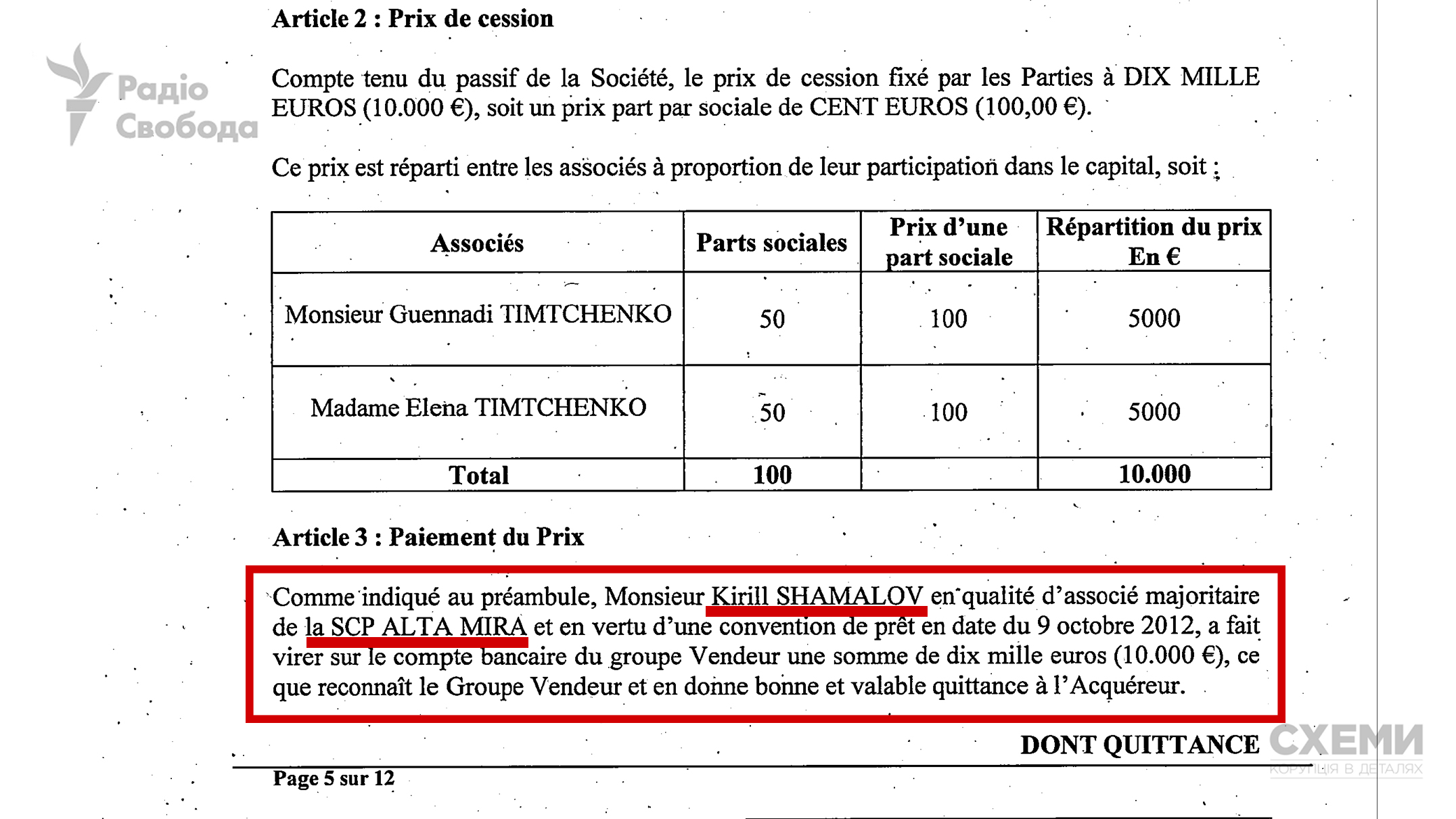В 2012 году, согласно выписке из документов, Тимченки передали акции компании SCI ATLANTIC (а вместе с этим и виллу)другой французской фирме – SCP ALTA MIRA. Ее представлял зять Путина до 2018 года Кирилл Шамалов. Он заплатил за акции 10 тысяч евро.