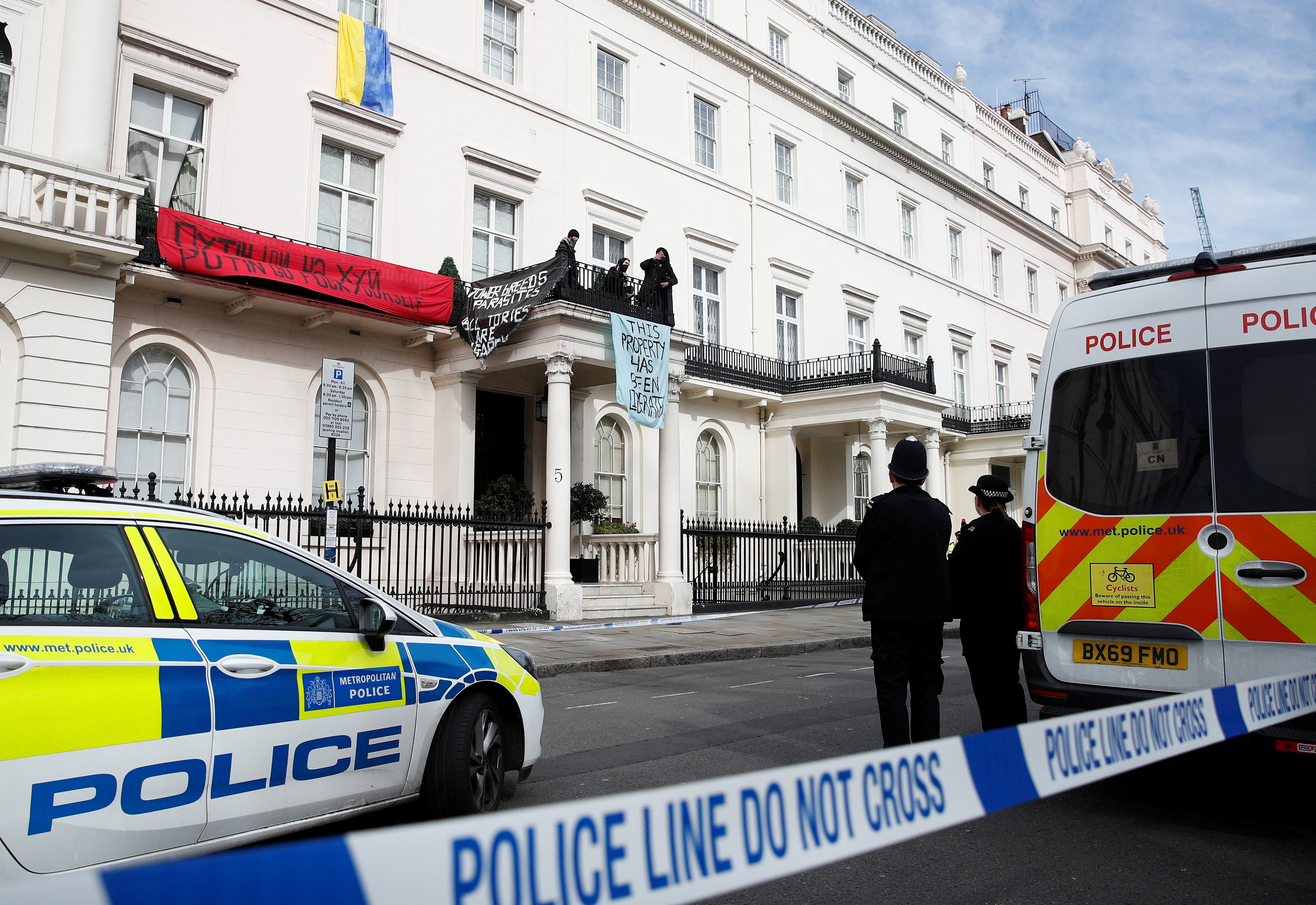 В Лондоне дом Олега Дерипаски, который был женат на падчерице дочери Бориса Ельцина, предшественника Путина на посту президента России, был захвачен ночью в понедельник, сообщает таблоид The Daily Mail. Из окна на фасаде здания вывешен украинский флаг, над входом повышен плакат "Это имущество освобождено", рядом – банер с нецензурным выражением в адрес Владимира Путина с переводом на английский, свидетельствуют фотографии с места событий.