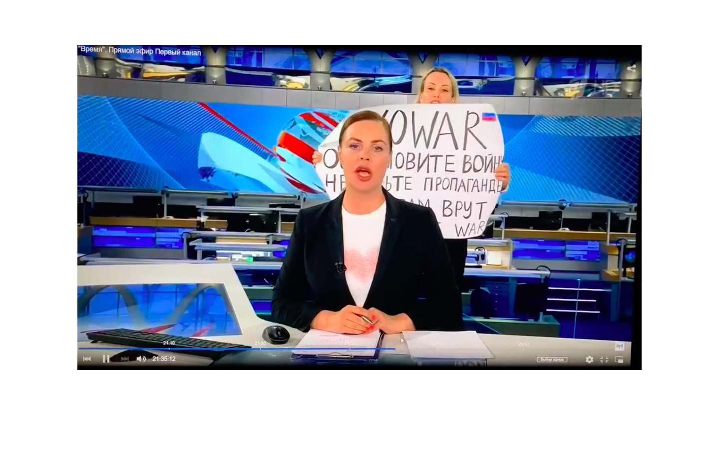 Вечером 14 марта сотрудница Первого канала Марина Овсянникова в эфире программы «Время» устроила антивоенную акцию. Она встала за телеведущей Екатериной Андреевой и развернула антивоенный плакат, на котором было написано: «No war. Остановите войну. Не верьте пропаганде. Здесь вам врут. Russians against war». Андреева в этот момент рассказывала о планах правительства по смягчению последствий от западных санкций. Спустя некоторое время режиссеры прервали эфир кадрами из заранее подготовленного сюжета.